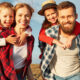 Happy young loving couple outside with backpack in free vacation camping